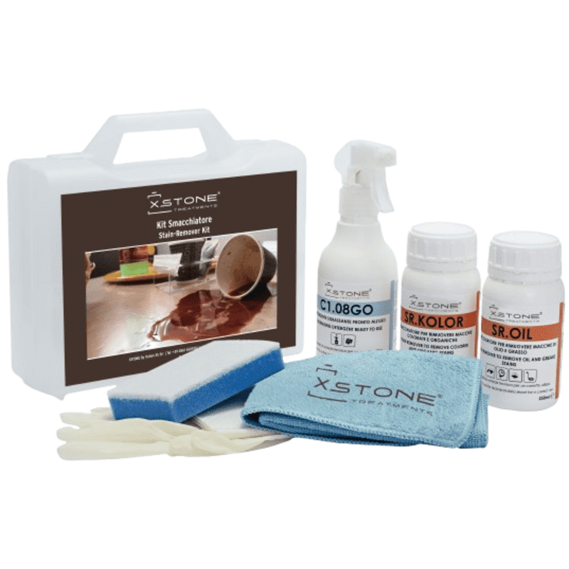 KIT COMPLET PROFESIONAL detergent + protectie pete de cafea, vin, ulei, grasimi pentru suprafete din piatra naturala, marmura, granit, cuartit, Blaturi Bucatarie, Baie, Grezzi, XSTONE, 250ml