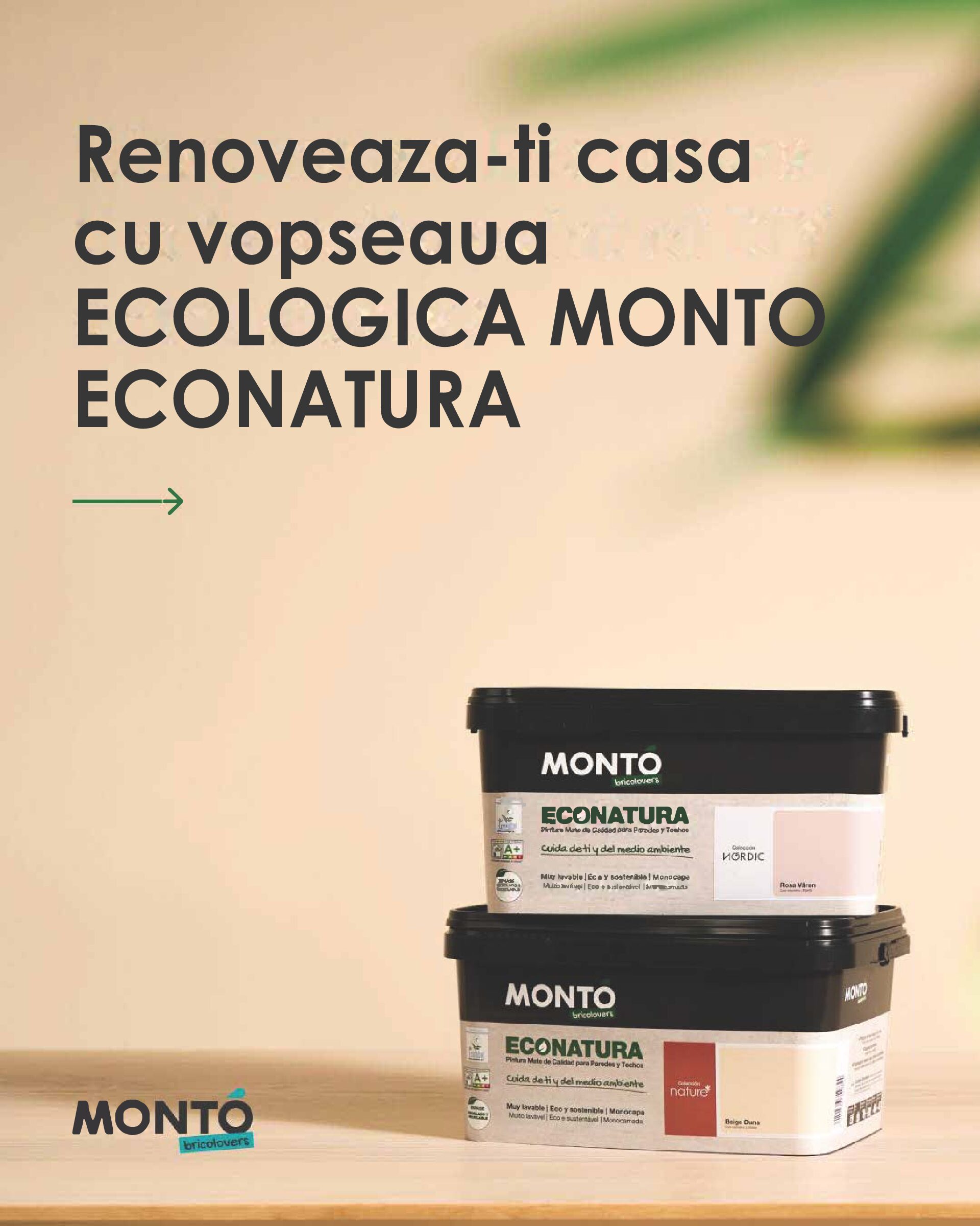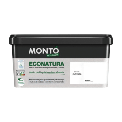 MONTO EcoNatura – Uită de retușurile constante. EcoNatura rezistă la uzură, spălări și zgârieturi minore, astfel încât pereții tăi să arate mereu impecabil.Vopsea ecologică mată, sustenabilă și certificată Ecolabel European pentru pereți și tavane interiori.Calitate superioară datorită lavabilității ridicate, acoperirii și performanței. Produce emisii minime și este inofensivă pentru sănătate și mediu. Nu generează mirosuri neplăcute.Ideală pentru spaţii rezidenţiale, instituţionale sau comerciale care pun accent pe calitate, mediu şi sănătate.Compatibila pentru suprafetele de interior, pereți și tavane, mortar de ciment, beton si cărămidă. Se aplica si pe gotelé (vopsea texturată / cu efect de strop) si gips-carton: PYL, PAL. Beneficii: