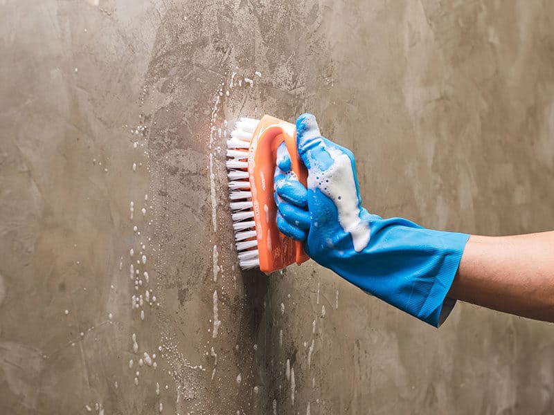 Lăsați amestecul să stea pe suprafața betonului timp de aproximativ 5-10 minute. Folosiți o perie de curățat din nailon (periile metalice pot lăsa bucăți mici de metal în beton care vor rugini) pentru a curăța întreaga suprafață. Folosiți o perie de curățare cu mâner lung atașabil pentru a vă salva spatele și genunchii.